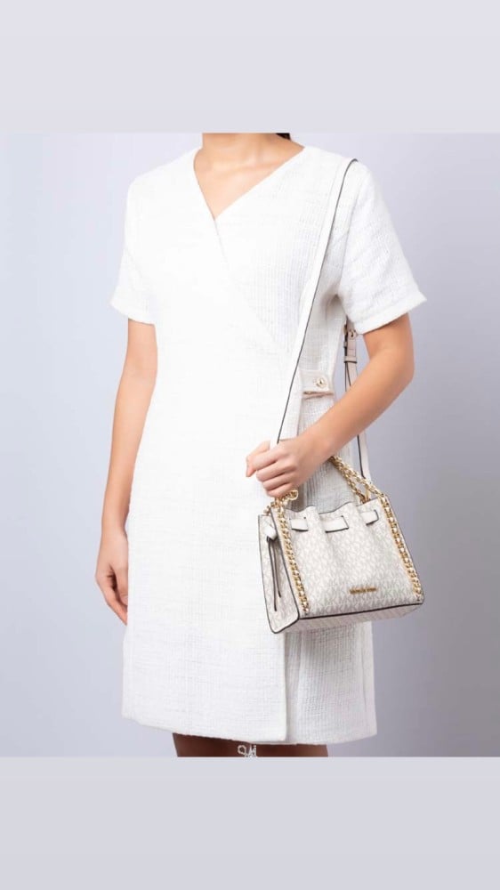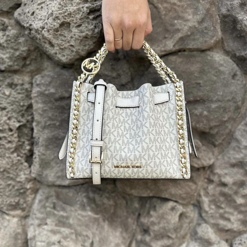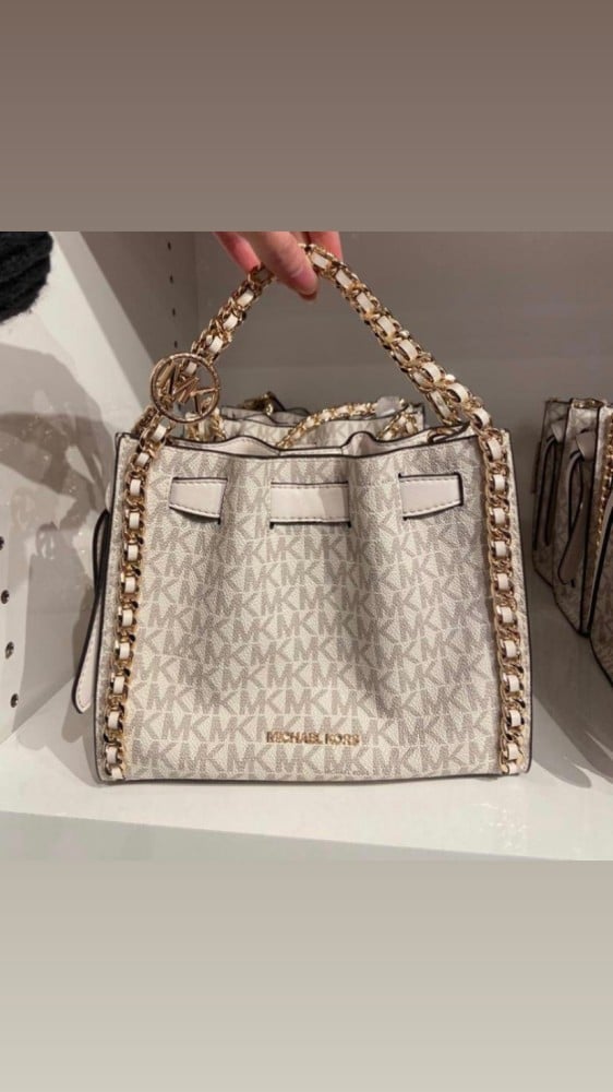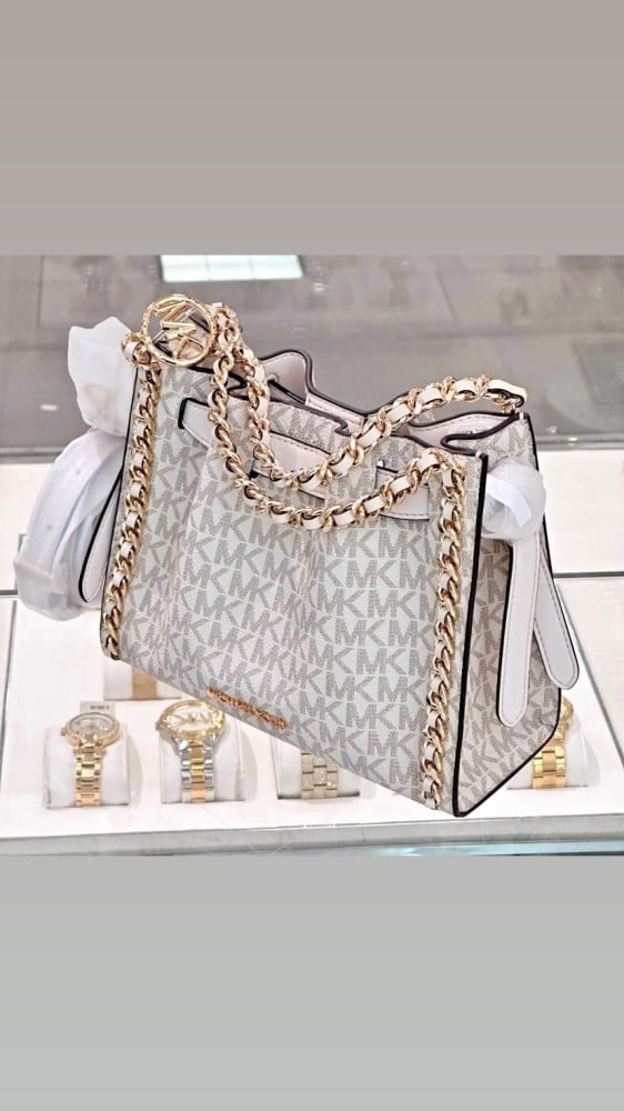 كون اكثر اناقه مع شنطة مايكل كورس لون فانيلا . شنطة نسائية ذات مواصفات وجودة عالية عليها شعار الماركة MK
